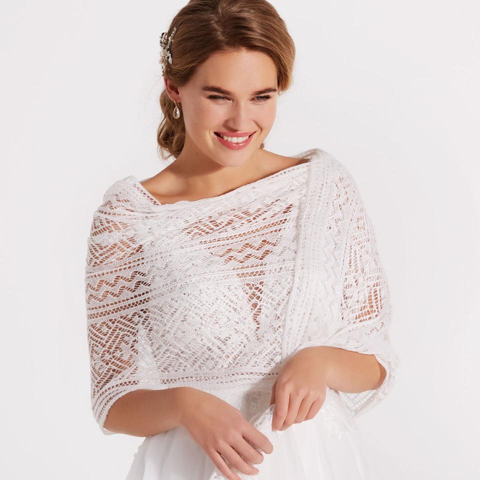 Ein Brautschal sorgt für einen entspannten und dennoch eleganten Look: Entweder locker über die Schultern geschlungen oder kunstvoll um den Körper drapiert tragen. Mit einer glitzernden Brosche erhält die warme Strick-Stola noch zusätzlich eine glamouröse Note!