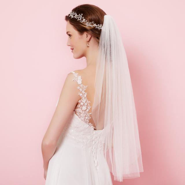 Satin umhüllt die Braut und drapiert ein Oberteil mit tiefem Dekolleté, das am Rücken sein Pendant findet. Ein vorne gereihter Rock in A-Linie sorgt für schwungvolle Weite in Midi-Länge. Dazu harmonieren Ballonärmeln und Bindeband. Mit Reißverschluss.
