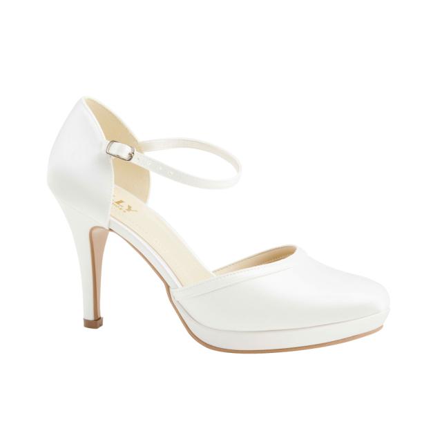Brautschuhe aus Satin mit 7 cm hohem Absatz und Fesselriemen.
